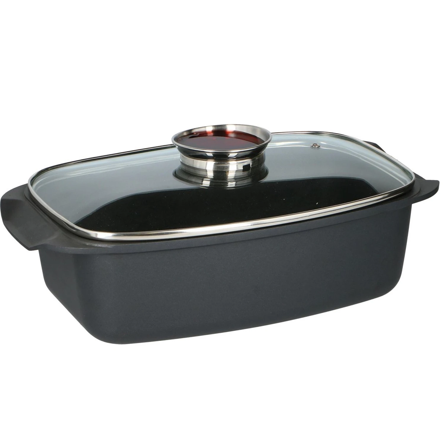 Braad de meest heerlijke gerechten in deze Alpina braadslede van gegoten aluminium. De braadslede is geschikt voor veel verschillende warmtebronnen behalve inductie. Gebruik de braadslede om gerechten vetarm te koken of smoren. De braadslede heeft een duurzame anti-aanbaklaag van Teflon-kwaliteit en wordt geleverd met een hittebestendig deksel. Het deksel heeft een aromaknop waardoor je vloeistoffen zoals wijn of bouillon druppelsgewijs kunt toevoegen. De braadpan heeft een afmeting (zonder deksel) van ca. 39,5 x 22,5 x 10,8 cm en met deksel ca. 40 x 22,5 x 15,5 cm.