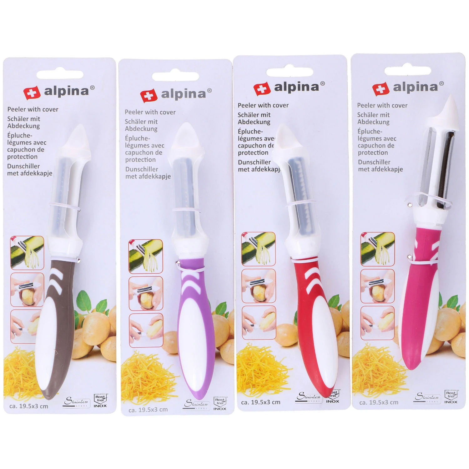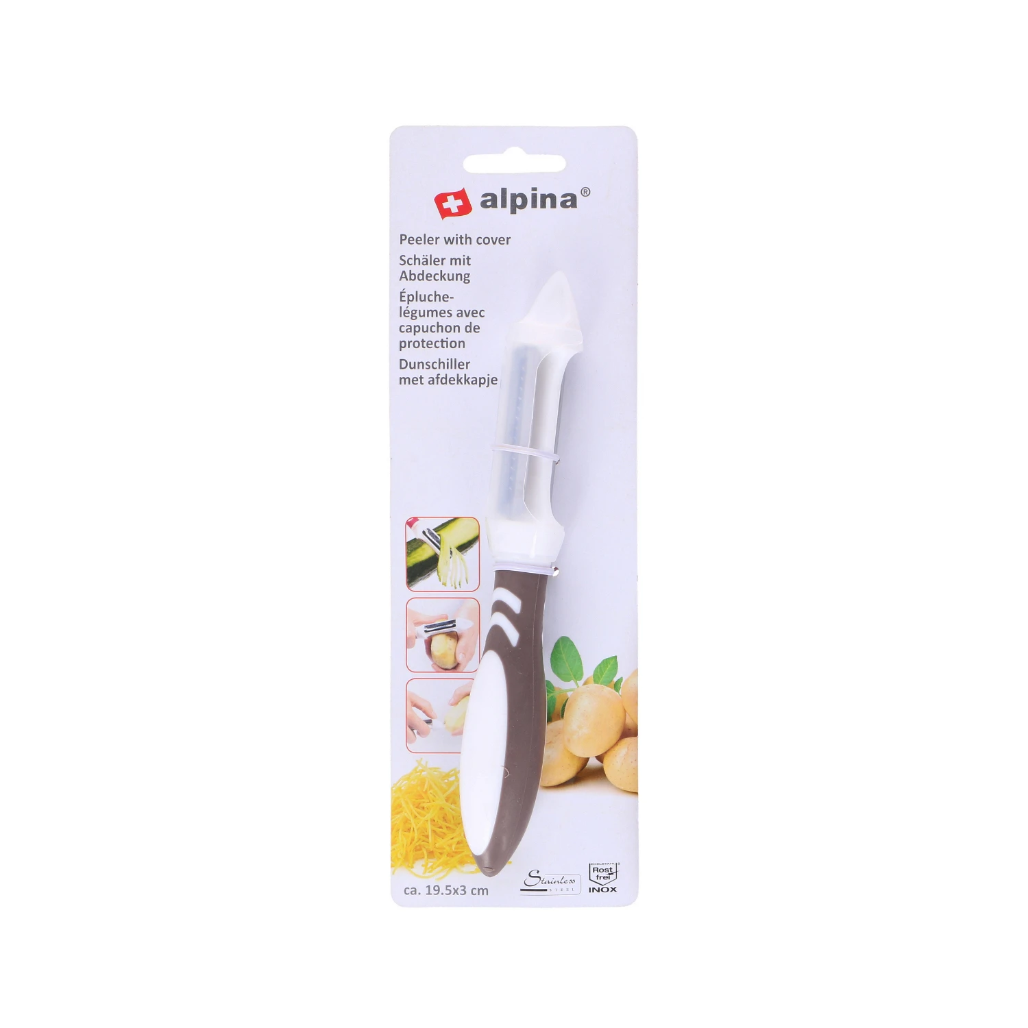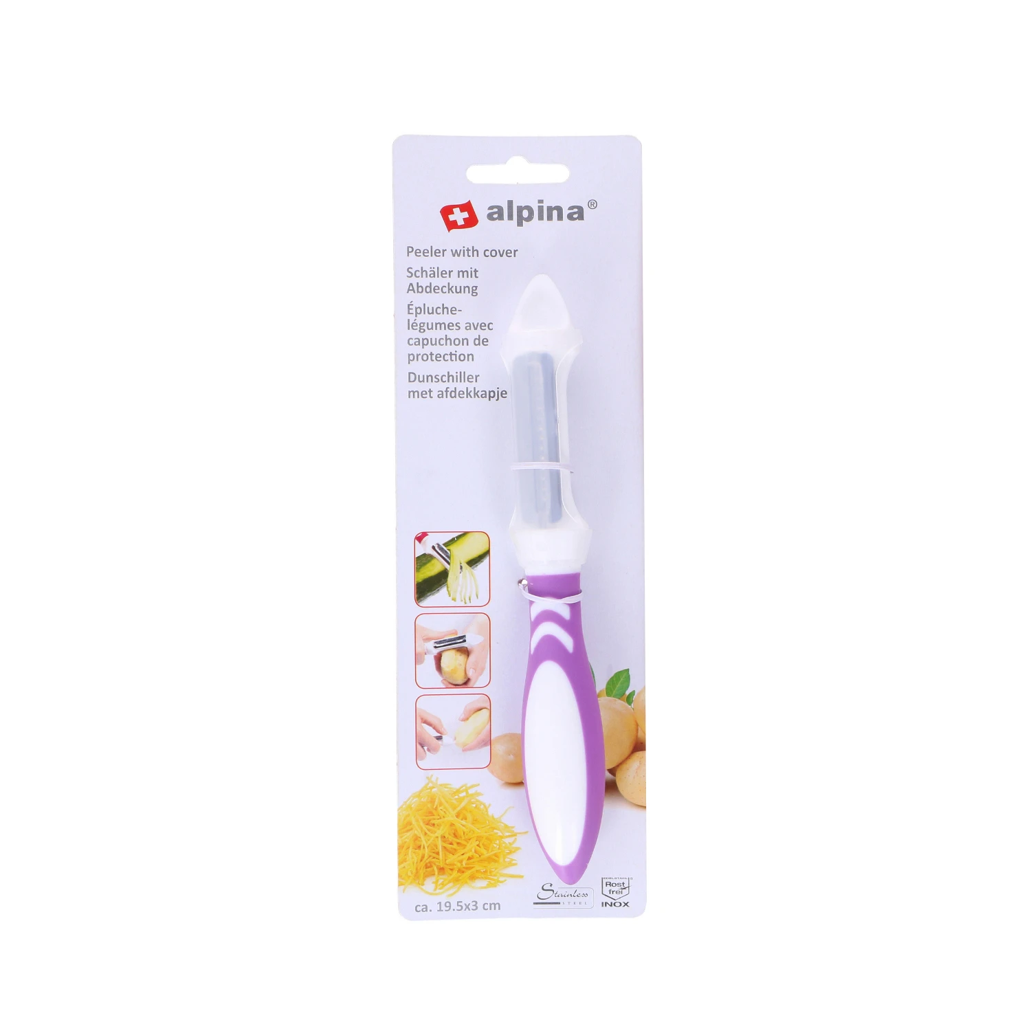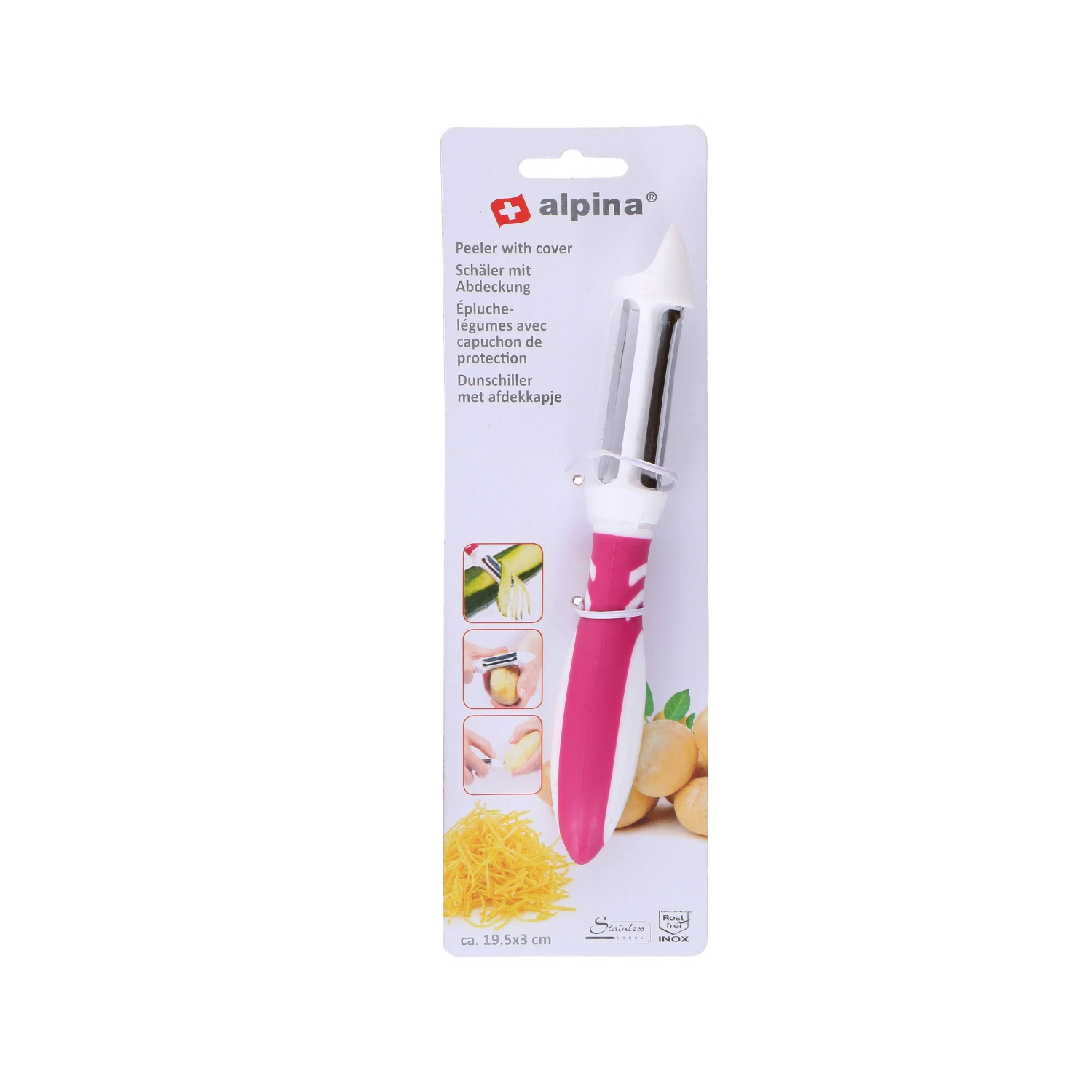 Deze dunschiller van Alpina is onmisbaar in de keukenlade. De praktische dunschiller heeft 3 functies, met het ene mes kun je normaal recht schillen, het andere dient als een julienneschiller en met de bovenkant van de dunschiller kun je aardappelogen verwijderen. Het keukenhulpje is er in verschillende kleuren, het is niet vooraf te bepalen welke je ontvangt.
