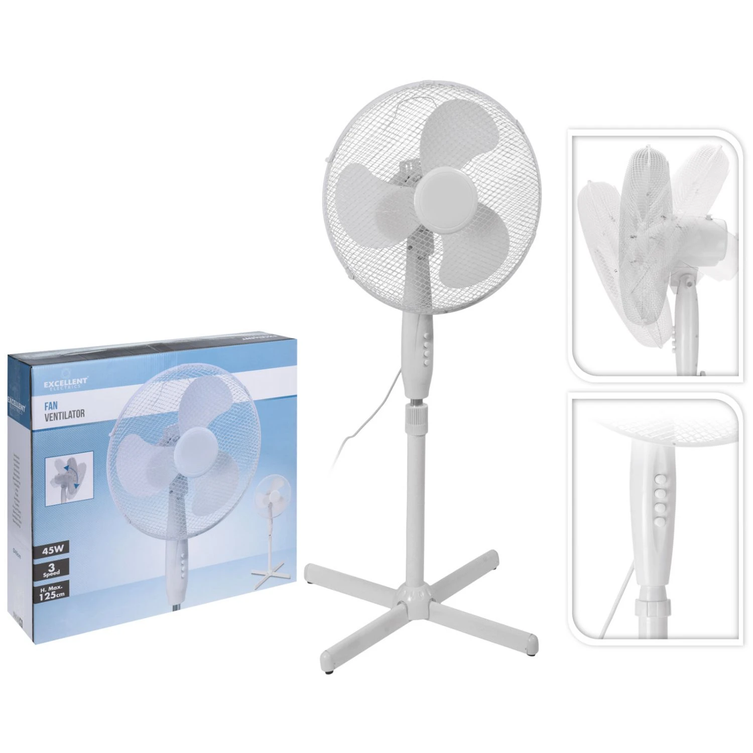 Verkoel elke ruimte met de Excellent Electronics ventilator staand Ø40 cm wit. De ventilator met standaard heeft 3 snelheidsstanden zodat je hem kan aanpassen aan jouw wensen. Er zit een automatische ronddraai functie op, op deze manier wordt de lucht door de kamer verspreid.